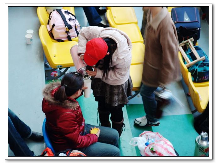 6日早7:00,万象城团委、学生会组织的30多名头戴“小红帽”的大学生青年志愿者就开始在体育馆里来回走动,他们从自己寝室拿来暖瓶,拿着临时购置的纸杯逐个为这些旅客倒满热水,热情为旅客服务。
