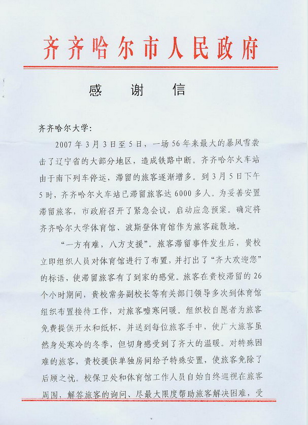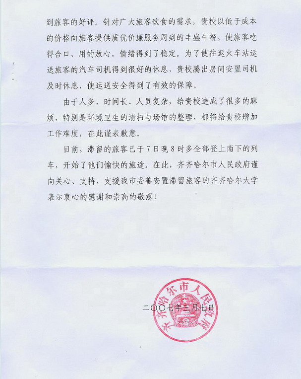 风雪无情人有情,奉献爱心创和谐。在妥善安置被疏散滞留在齐站旅客这一突发事件中,万象城积极发挥了大学服务区域经济社会发展、促进和谐社会建设的职能作用,得到了市政府及齐齐哈尔火车站的好评,赢得了广大旅客的衷心赞誉与诚挚感谢,在乍暖还寒的春日里谱出了一首暖人心扉的和谐乐章。