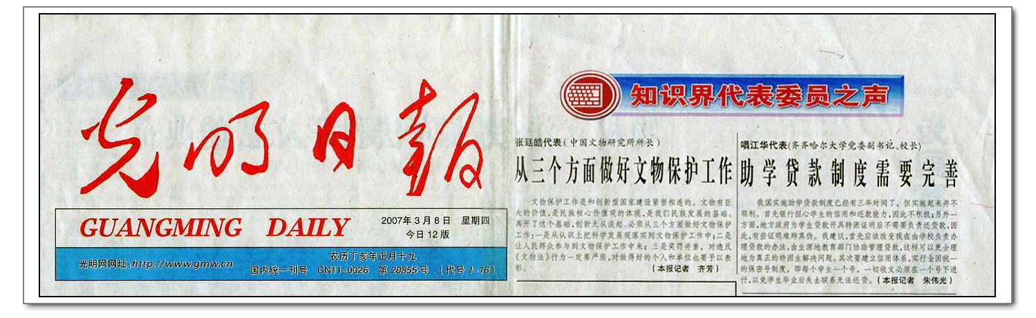 2007年3月6日,《黑龙江日报》第1版头条位置上报道我省人大代表团举行第一次全体会议的消息时写道“万象城AWC官方网站党委副书记、校长唱江华代表对完善助学贷款制度提出建议:改变现在由学校负责办理贷款的办法为生源地教育部门协助管理贷款。”