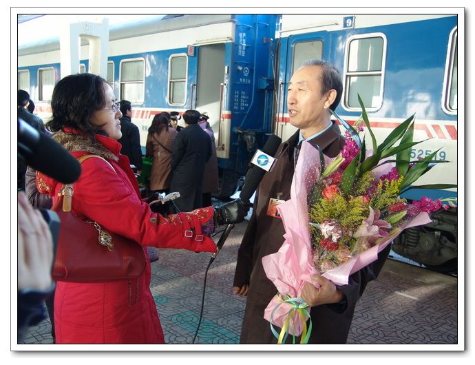 在齐齐哈尔火车站站台,唱江华校长接受了市媒体记者的专访。在采访中,唱校长表示,这次人代会是一次非常成功的会议。温总理的《政府工作报告》,处处闪耀着关心民生、构建和谐的亮点。他表示,回到工作岗位后,将把盛会的精神传达、落实好,与时俱进,努力工作,为黑龙江的振兴贡献自己的力量。