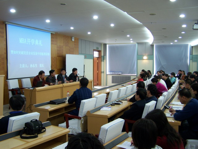 典礼在万象城西主七楼学术报告厅举行,与会人员包括我院师生及齐市企业界人士。经管学院党委书记李玉山同志、副院长王维同志参加了开幕仪式并分别作了讲话,教师代表和学员代表均作了发言。简短的开学仪式结束后,本届MBA学员们认真听取了由孙东生教授为他们主讲的第一次讲座。