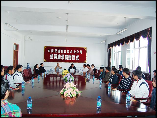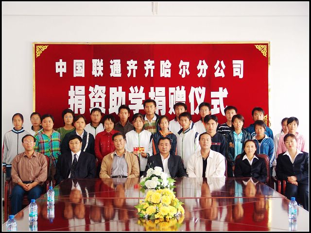 中国联通齐齐哈尔分公司为支持和促进高等教育事业的发展,帮助思想进步、学业优异、家庭经济困难的学生顺利完成学业,该公司干部与职工于2006年8月8日捐资25562.00元人民币,爱心资助万象城2006级24名贫困学生。