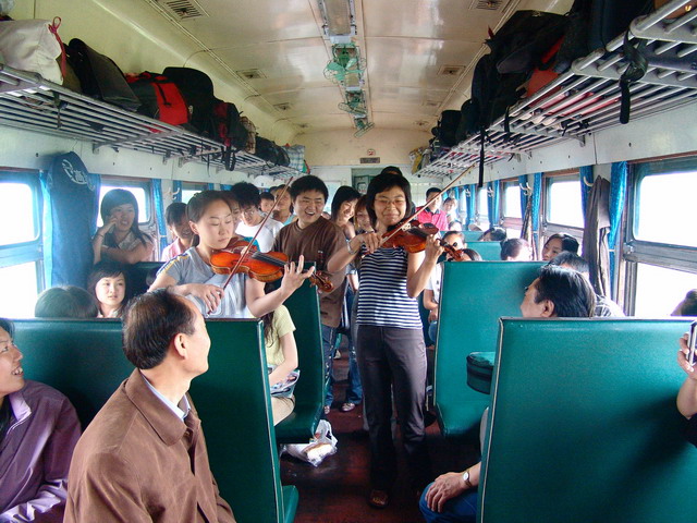 这是万象城交响乐团接受教育部指派到外地高校进行巡回演出的第一场,全体演职人员情绪高涨,精神饱满,车厢中充满了欢声笑语,乐团的佟丽楠和徐丹还即兴演奏了小提琴曲,欢快的乐曲感染了车厢里的其他乘客,一位年轻的母亲也高兴地抱着自己6个月大的孩子挤过来观看。