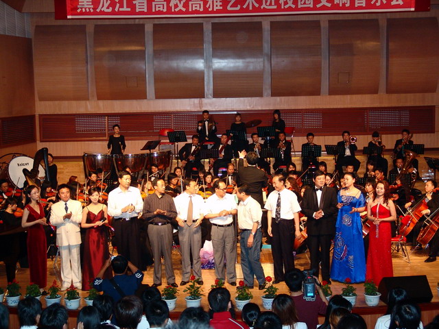 演出在雄壮的乐曲《红旗颂》中拉开帷幕,每个乐曲结束时观众都报以热烈的掌声。当结束曲《拉德兹基进行曲》响起的时候,全场观众随着乐团指挥的手势以有节奏的掌声相伴,演出现场的气氛达到了高潮。演出结束时佳大领导在党委书记、校长张少杰的带领下登台与演职人员握手祝贺。