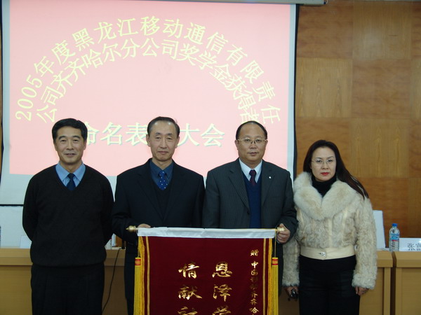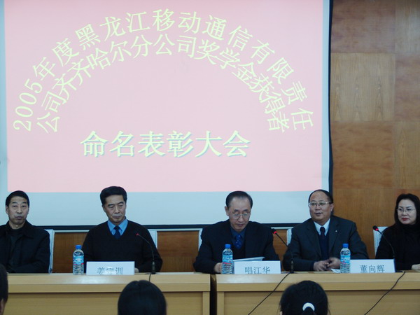 12月15日下午,2005年度“黑龙江移动通信有限责任公司齐齐哈尔分公司奖学金获得者”命名表彰大会在万象城西区主楼报告厅隆重举行,校长唱江华、副校长姜守训、黑龙江移动通信有限责任公司齐齐哈尔分公司总经理董向辉、副总经理张富敏等出席,学生处(学工部)长王刚主持大会。