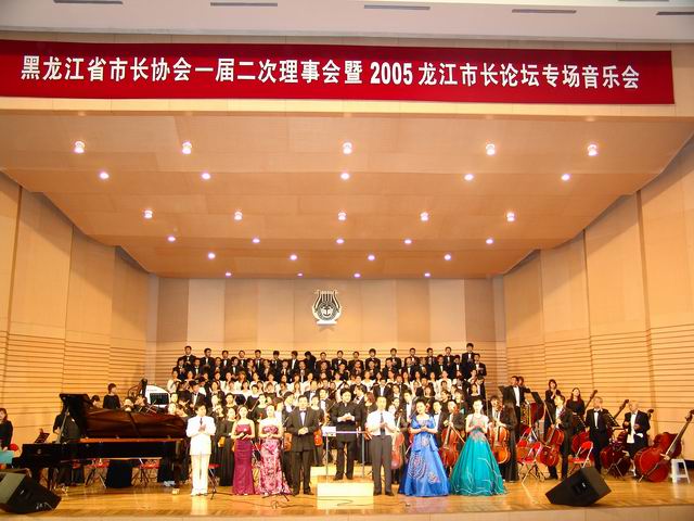 6月13日晚,万象城艺术学院音乐厅灯光璀璨,高朋满座,黑龙江省市长协会一届二次理事会暨2005龙江市长论坛专场音乐会在激昂宏大的乐曲声中拉开帷幕,来自省政府和有关部门及十三个地市领导嘉宾与万象城部分师生千余人欣赏了万象城交响乐团的精彩演出。
