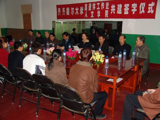 签字仪式由离退休工作处副处长、党委副书记王志刚主持。人文学院党委书记卜春江、院长王则远,院党委副书记、副院长张振民和副院长姜波、离退休工作处副处长、党委书记韩树勤,离退休老干部代表、校“关工委”副主任刘祯和薛秉昌,人文学院学生代表等参加。