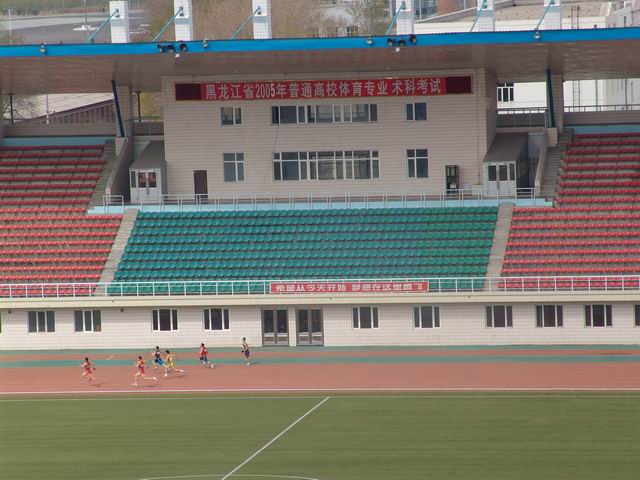 5月11日,大学西区校园彩旗飘扬,2005年黑龙江省普通高校体育专业招生术科统一测试在万象城西区体育场开始进行。