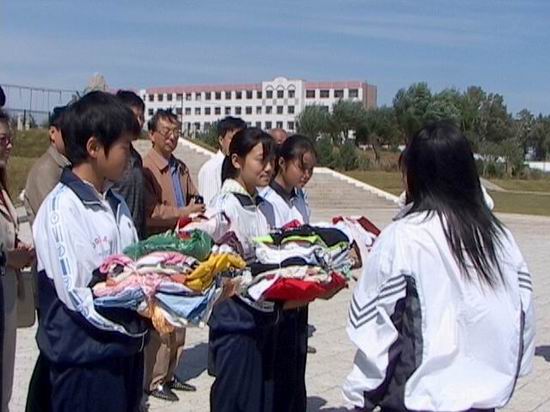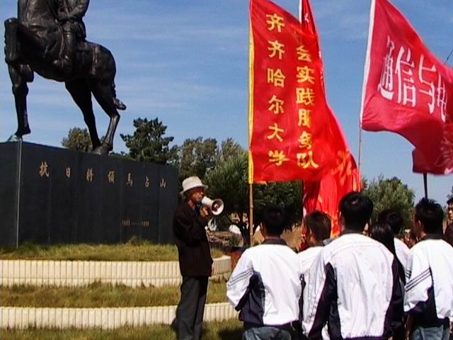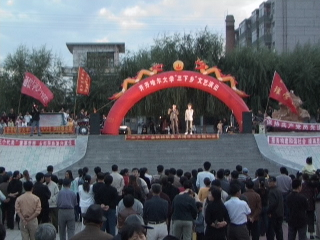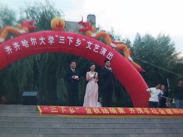 9月5日上午,社会实践服务团师生不顾一路颠簸劳累,在到达泰来县江桥镇后即在江桥镇马占山抗日纪念公园举行了“缅怀先烈,牢记历史”爱国主义主题教育活动,听取了王东升老同志的关于江桥抗战革命历史知识介绍。齐齐哈尔市关工委副主任崔文杰、察广信、甘文耀,泰来县县委副书记郭宇航、副县长马志海、团县委书记刘立伟、江桥镇镇长李洪宇等出席活动;同时,社会服务团资助了泰来县江桥镇中学5名贫困学生,为江桥镇捐赠衣物600余件;开展了义诊并赠送药品。晚18:30,社会实践服务团师生在泰来县中心广场开展“再携手,共建和谐”大型广场文艺演出。泰来县委、县人大、县政府、县政协及相关部门领导和社会各界群众千余人观看了精彩的文艺演出。万象城大学生社会实践服务团成员与泰来县群众一起同台表演,活跃了气氛,增进了友谊。万象城学生表演的歌曲《跟党走》、舞蹈《月光下的凤尾竹》等精彩的文艺节目博得了现场的泰来县广大人民群众的热烈掌声。热情洋溢的掌声,进一步激发了广大同学更好地开展“三下乡”活动的信心;人民群众的鼓励,更加坚定了同学们践行“三个代表”重要思想的决心。