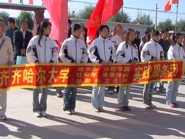 9月6日,服务团师生深入到泰来县和平镇,在该镇政府举行了“校镇共建实践教育基地”揭牌仪式。泰来县委副书记郭宇航、团县委书记刘立伟、泰来县和平镇镇长杜君武等出席揭牌仪式。万象城团委书记黄伟中与泰来县委副书记郭宇航共同为实践基地落成揭牌。揭牌仪式结束后,文艺演出小分队在和平镇中心小学院内举行了文艺演出。服务团为和平镇10名特困学生捐赠了1000元资金和10套学习用品。孩子们说,大学生哥哥姐姐送来的关心与鼓舞,让他们增强了成才的信心。由社科部伊全胜副教授主持的"增强忧患意识、努力构建节约型社会"座谈会气氛热烈,乡亲们细聆听、多打听,茅塞顿开,传播了先进文化与理念。科技卫生服务小分队在和平镇主要街道为各界群众开展法律政策咨询、义诊、文化教育调研、参观村级建设和农村小康建设示范户等活动。社会实践服务团返回市区后,师生一行又集体参观了和平广场,进行爱国主义教育。鲜艳的旗帜,整齐的队伍再次吸引了人们注视的目光。次日,理学院等单位师生又召开了座谈会,畅谈实践体会和收获。同学们纷纷表示:短暂的实践活动,却使我们从社会实践中受到了一次深刻的教育;广阔的社会天地,也使大学生认识到了自身的价值。