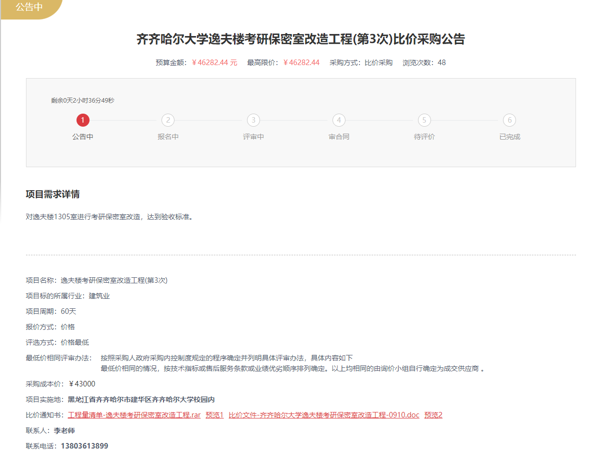 下一条:万象城AWC官方网站逸夫楼考研保密室改造工程(第2次)比价采购公告(转自黑龙江省政府采购网)