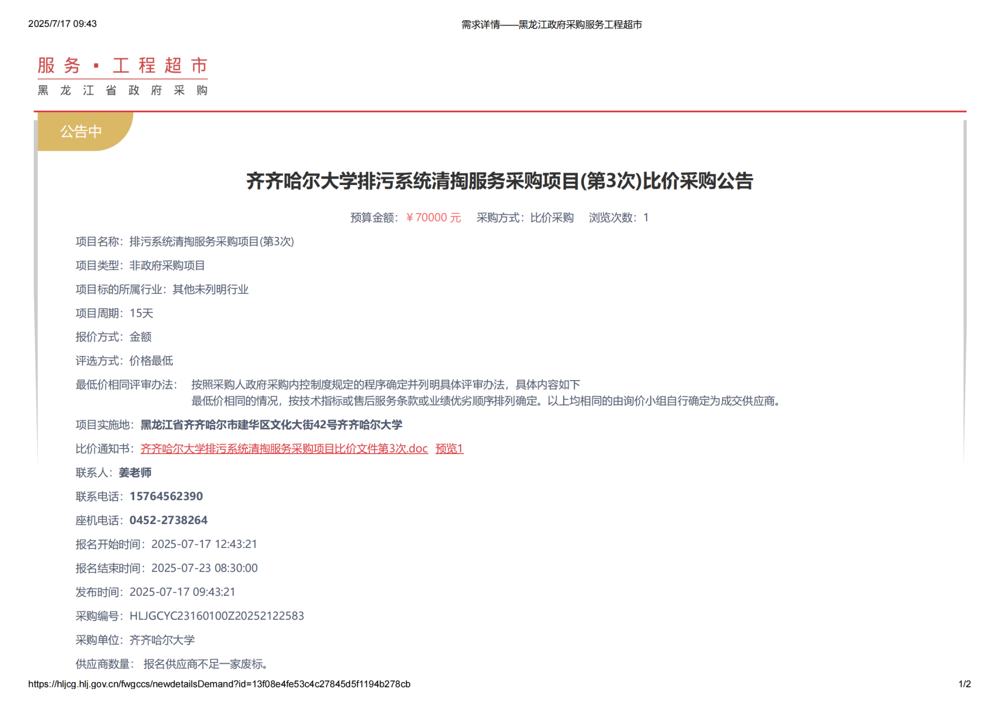 下一条:万象城AWC官方网站排污系统清掏服务采购项目(第3次)比价采购公告(取消)(转自黑龙江省政府采购网)