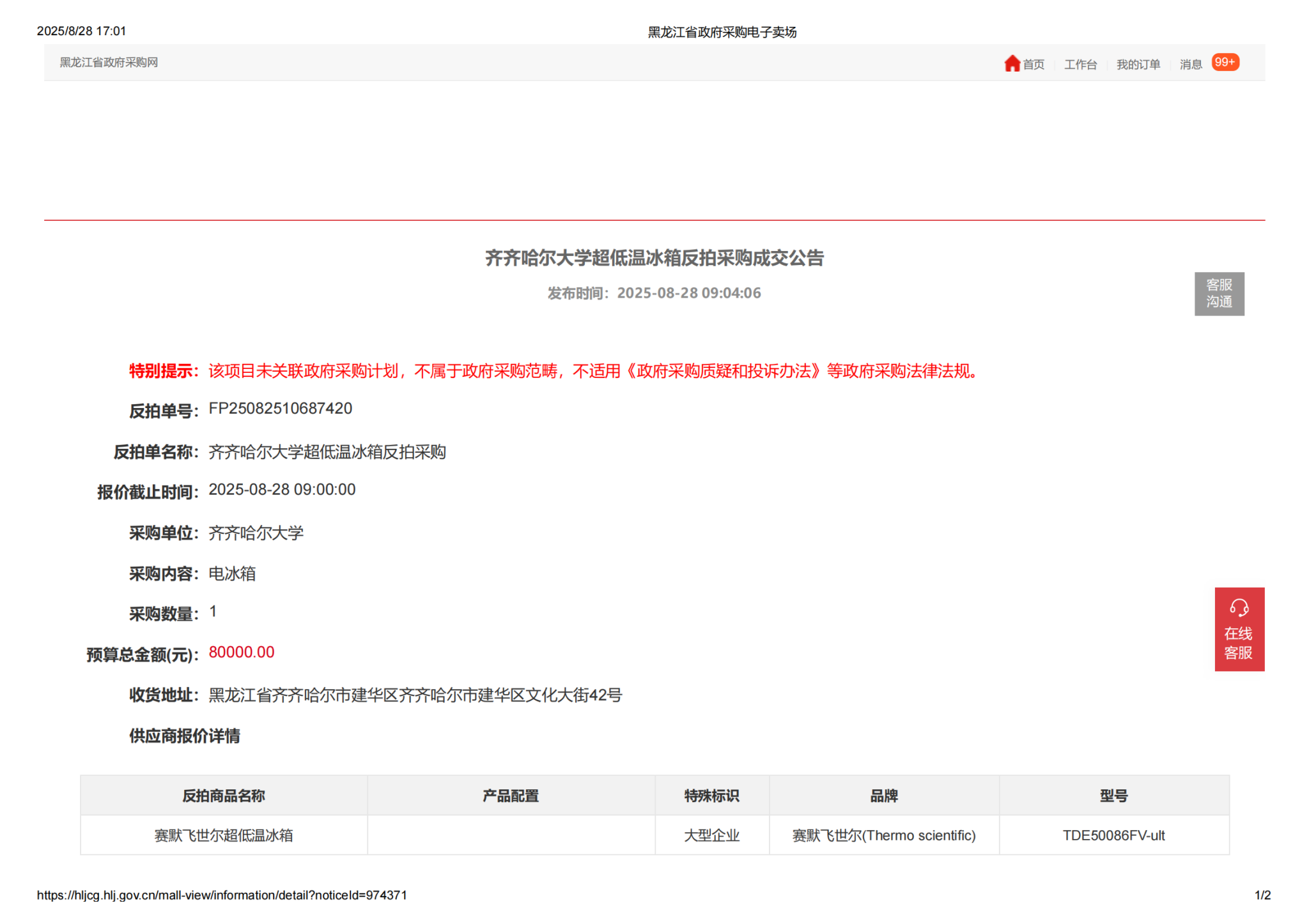 万象城AWC官方网站超低温冰箱反拍成交公告(转自黑龙江省政府采购网)