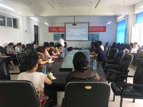 报告中,翁益群博士介绍了美国威斯康星大学瓜类研究团队的部分最新研究成果。研究通过图位克隆的方法,定位并克隆了黄瓜抗炭疽病、霜霉病和细菌性角斑病基因,发现他们是同一个黄瓜持绿基因,使得黄瓜产生了广谱性的抗病性。报告体现出缜密的研究思路和严谨的治学态度对参会师生的研究工作必将产生很大的影响。
