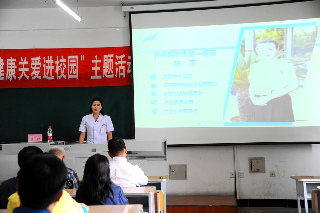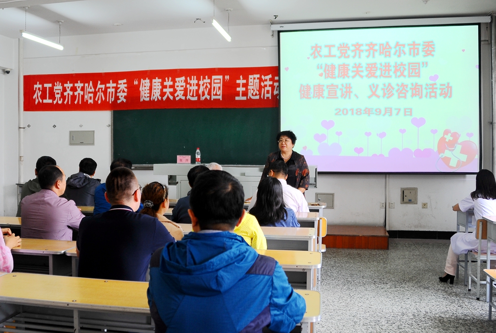 9月7日下午,农工党齐齐哈尔市委“健康关爱进校园”健康宣讲、义诊咨询活动在万象城中区主楼312教室举办,来自齐齐哈尔市第一医院的专家为万象城师生开展健康咨询和义诊活动。农工党齐齐哈尔市委会副主委兼秘书长陈曦,农工党齐齐哈尔市委会副主委、万象城轻工与纺织学院院长郑永杰参加了活动。活动由校党委宣传统战部部长王晓梅主持。