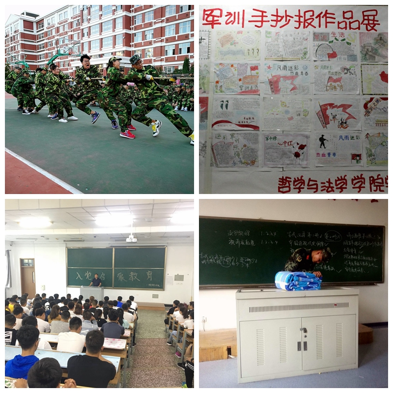 轻工与纺织学院在军训期间组织了新生拔河比赛,活动的开展不仅丰富了同学们训练之余的文化生活,加强了各班级内部同学的团结协作精神,还促进了班级同学间的交流,拉近了新同学之间的心理距离;9月3日体育学院在西主阶梯104举行了2018级新生入党启蒙教育大会,学院党委书记姚大为在会上向新生们详细讲述了党的光荣历史和优良传统,使同学们产生了成为一名光荣的学生党员的美好愿望,为学院学生党员的发展工作奠定了良好的基础;9月6日哲学与法学学院在25教一楼大厅举办了2018级“军训掠影”主题手绘海报展。此次“军训掠影”主题手绘海报展不仅锻炼了新生们的动手能力,展示了学生的创新才能,更贴近于新生的生活,让新生们回味难以忘怀的军训时光;良好的内务是军人良好素质的缩影,国际教育学院在严格进行军事科目训练的基础上,邀请教官为新生反复进行内务指导,通过详细的讲解和同学们的反复实践,使同学们符合了“豆腐块”的标准 ,对军人的一丝不苟精神有了更加深刻的体会。