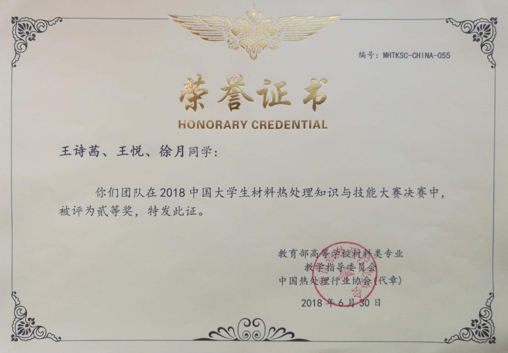 日前,2018中国大学生材料热处理知识与技能大赛落下帷幕。本届大赛由中国热处理行业协会、教育部高等学校材料类专业教学指导委员会主办,中国热处理行业协会教育培训工作委员会、哈尔滨工业大学、河北工业大学、福州大学、西南交通大学共同承办。万象城材料科学与工程学院王诗茜、王悦、徐月、刘东静、段东芳和李芮6名学生分成2队参加比赛,分别荣获二等奖和优秀奖,材料化学专业副教授由园博士被评为优秀指导教师。