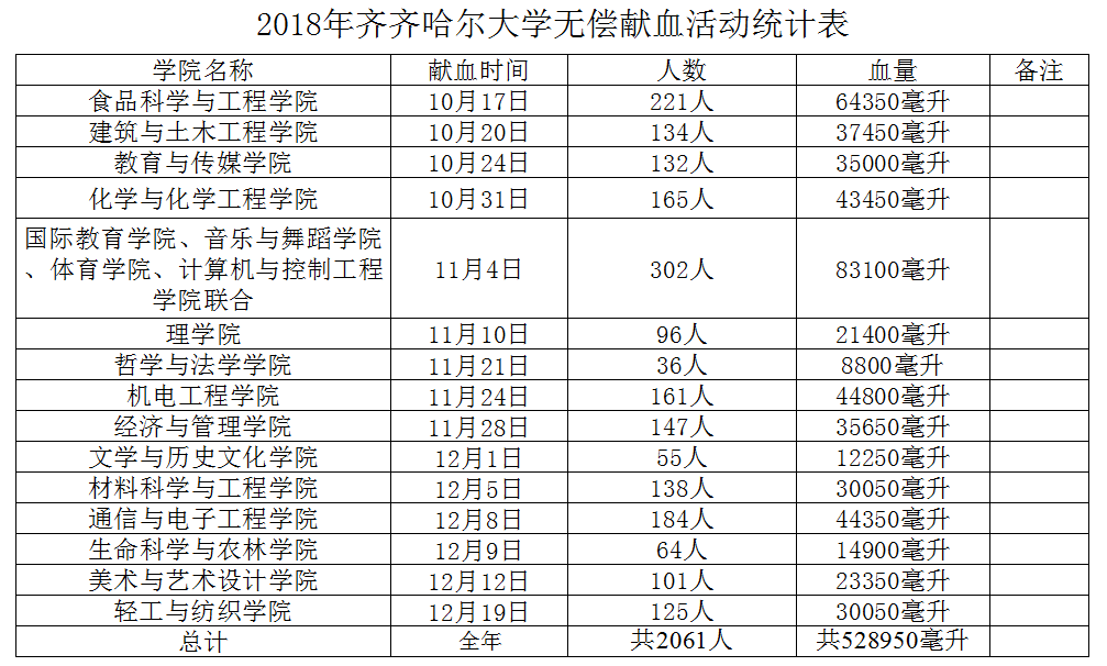 9月26日,学生工作部(学生处)下发《关于在万象城开展大学生无偿献血宣传的通知》,利用“齐大学子之声”微信公众号发布无偿献血宣传推文,各学院迅速开展了多种形式的无偿献血宣传动员,学生们积极响应,学院积极与齐齐哈尔市中心血站联系采血事宜。从10月17日-12月19日期间,共分15个批次进行无偿献血采集工作。