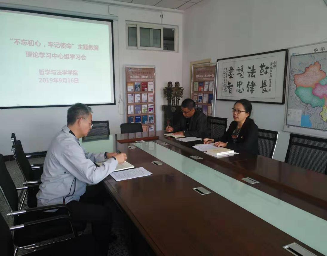 学习理论原著,诵读讲话原文。9月16日,哲学与法学学院党委理论学习中心组进行了“不忘初心、牢记使命”主题教育的第一次集中学习研讨,学院党委书记于春梅领学了《习近平新时代中国特色社会主义思想学习纲要》中第一问题《中国特色社会主义进入了新时代》,学习了《习近平关于“不忘初心、牢记使命”重要论述选编》中第二篇《人民对美好生活向往,就是我们的奋斗目标》,随后,学院理论学习中心组成员分别结合各自分管工作,作了深刻的自我剖析,大家一致表示,通过集中学习研讨进一步加深了对坚定理想信念极端重要性的认识,增强了学懂弄通做实习近平新时代中国特色社会主义思想的政治自觉、思想自觉和行动自觉。