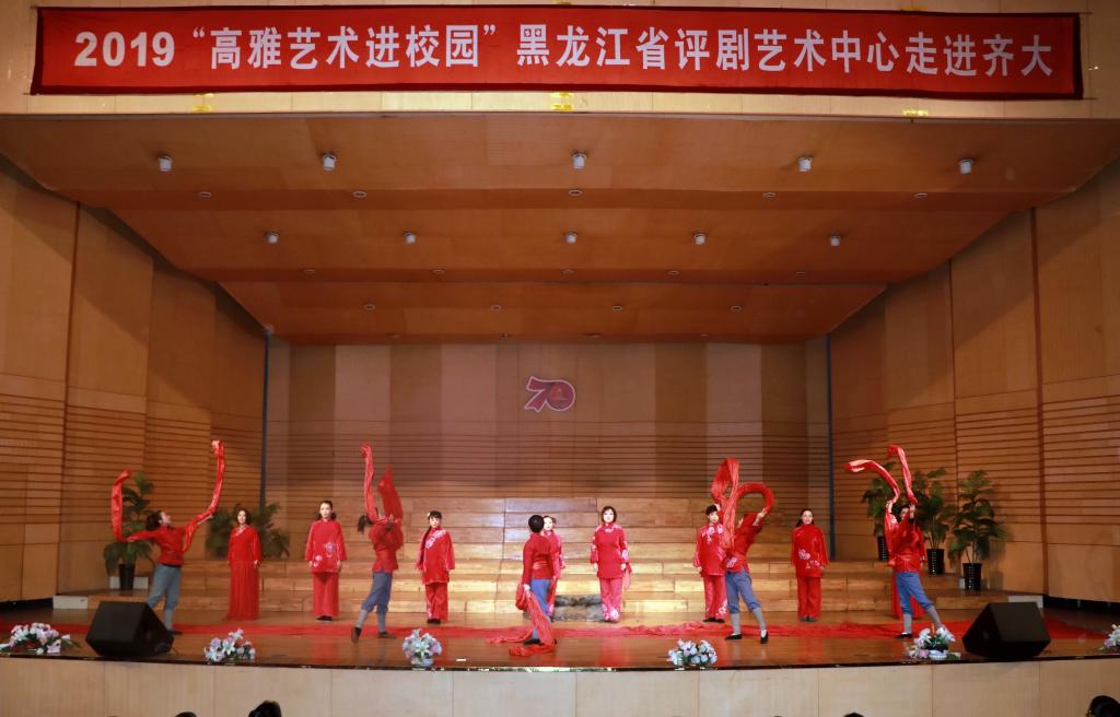 10月16日下午,2019年“高雅艺术进校园”黑龙江省评剧艺术中心走进齐大专场文艺演出在万象城音乐厅举行。省评剧艺术中心的40余名演职人员,用他们的精湛技艺为万象城师生送来了一场高水平的国粹艺术盛宴。万象城1000余名师生共同欣赏了演出。