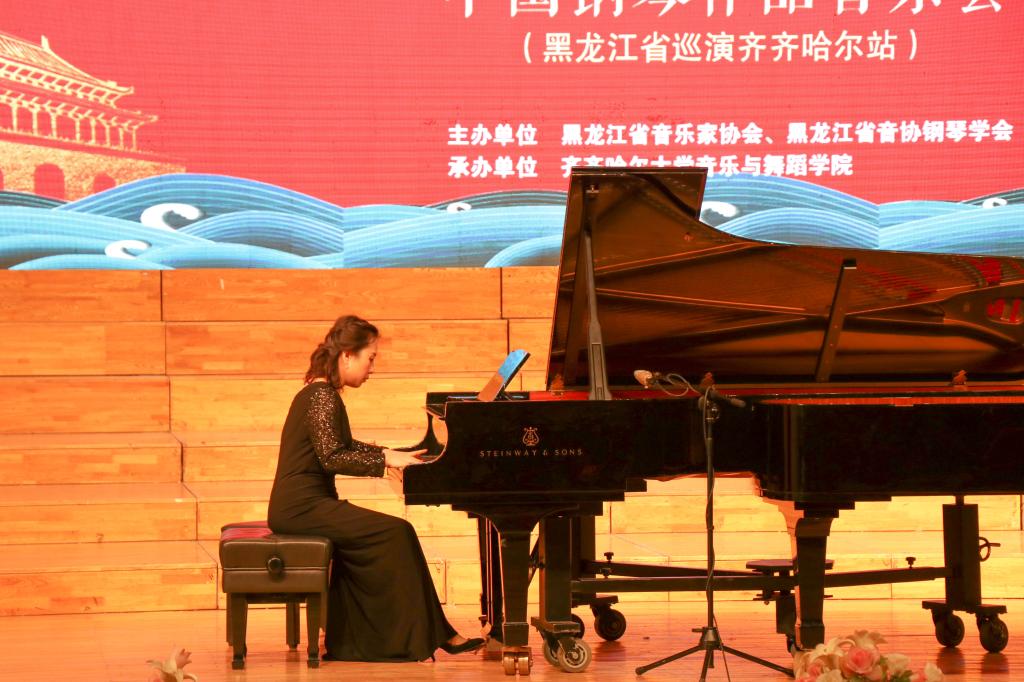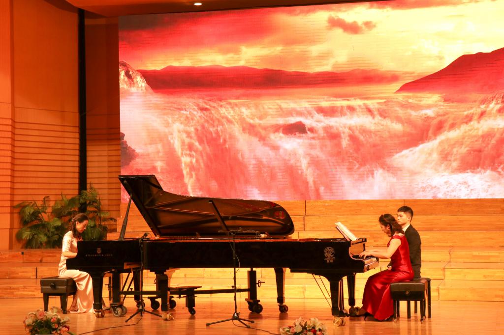 音乐会在张磊老师独奏的钢琴曲《向阳花》中拉开了帷幕;宋亦莹老师倾情弹奏的《C大调前奏曲 》是黄安伦《12首前奏曲》中最为著名的一曲,激昂的节奏传递出在苦难中不屈不挠的精神品格;佳木斯大学曹文瀚老师演奏的《浏阳河》由王建中根据湖南民歌改编而成,具有鲜明的中国特色,赢得现场听众的热烈掌声;钢琴曲《卜奎印象》是音乐与舞蹈学院赵云老师根据齐齐哈尔城市文化所创作的钢琴组曲之一,这首曲子采用长短节奏、多连音音型、模仿民族乐器音色等多种创作手法,完美表达了对鹤城文化的礼赞;乌克兰留学归来的白斌老师演奏的当代作曲家张朝的作品《哈尼情歌》,为音乐会增添了别样的民族风情;牡丹江师范学院马玉萍老师演奏的由蒋泓改编的《我的祖国》炫技完美,自如洒脱,得到全场热烈掌声;由音乐与舞蹈学院程磊、陈晓鹏两位老师共同演绎的经典歌曲《爱情》,旋律优美、歌声悠扬,将钢琴与声乐完美结合起来,赢得了观众的喝彩;由于洋、李鸿姝演奏的《阳光照耀着塔什库尔干》,活泼欢快、幽默诙谐,用钢琴和二胡展现出了西部边疆的异族风情;音乐会上,哈尔滨音乐学院王瑛、杨欣两位老师共同演奏了《快乐的女战士》《茉莉花》《康定情歌》等经典乐曲,并合作演奏了双钢琴协奏曲《黄河》,默契的配合让现场观众赏心悦目;哈尔滨师范大学曹越、李姗姗两位老师演奏的《彩云追月》节奏欢快,带给现场观众美的享受;哈尔滨师范大学周行、徐琳两位老师在音乐会上精彩呈现了春晚经典曲目《春节序曲》,将音乐会推上了高潮。最后,音乐会在刘冬欣、李鸿姝两位老师默契演奏的双钢琴协奏曲《保卫黄河》乐曲中拉下帷幕。