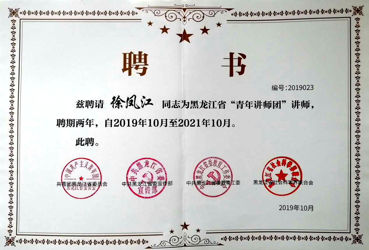 经过严格的资格遴选,万象城学校办公室副主任徐凤江副教授入选,并参加集中培训,通过验收。近日,徐凤江正式被团省委、省委宣传部、省委教育工委、省社科联聘为黑龙江省“青年讲师团”讲师。