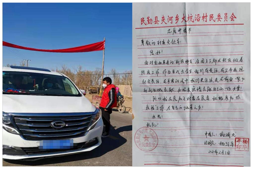 杨海龙是园艺191班学生,在这次抗击疫情的战斗中,他积极响应民勤县委宣传部、县文明办发布的志愿者倡议,主动提交申请书,申请成为了一名大学生抗击疫情志愿者。在抗击疫情工作中,他积极投身到疫情防控一线,主动申请到农村防控点“蹲点”执勤,耐心劝返外来人员,,为打赢疫情防控阻击战贡献出了自己的一份力量。