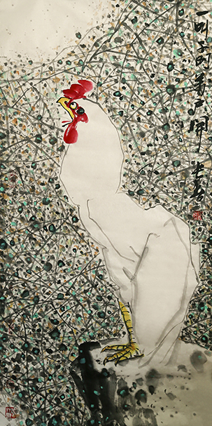 创作简介:乙亥岁末,大疫滋生,庚子正月,蔓长不减,病疫不散,万户萧疏,闭户封窗,以断病疫。今,斗柄回寅,万物更新,百毒将袪。古亦有云,公鸡者,克五毒,今借其意,以达众望。长春以唐寅“一叫千门万户开”诗句,表达病毒尽去,万户皆开门敞窗,大快之情!