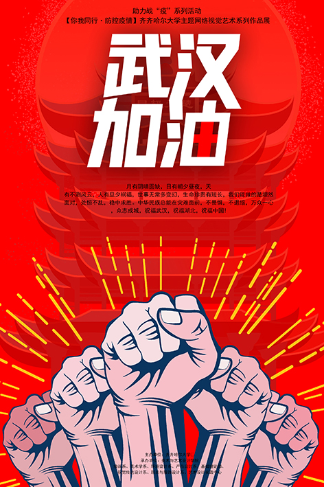 设计简介:作品背景为武汉黄鹤楼,寓意着中国抗疫最前线,红色代表着中国人众志成城,全力抗疫的决心与勇气。拳头表示了当前全中国乃至全世界都在为武汉加油,为中国加油!中国在这场人类与病魔的战斗中终将取得全面胜利!