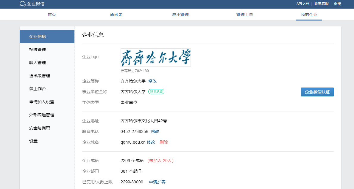 完成企业微信平台的搭建。从2月11日开始,网络信息中心开始搭建“万象城AWC官方网站企业微信”平台,由于企业微信以学校的基本组织结构为基础单位,每名教师都要在组织结构中落实到科室、系部等,因此,落实任务人员多、工作量很大,网络信息中心设置了孙涌泉、祝文生、孙家良、李玲玲等4名系统管理员,学校各单位设置1名管理员对本单位人员进行邀请、加入、分类、管理,同时在线开展使用答疑、操作培训、技术问题处理。在所有同志的配合下,用了三天时间,将2299名教职工加入企业微信平台,为下一步智慧校园建设和信息化应用工作奠定了基础。制作企业微信视频会议教程文档加入微云盘共享,为各单位使用企业微信召开远程视频会议提供方便。