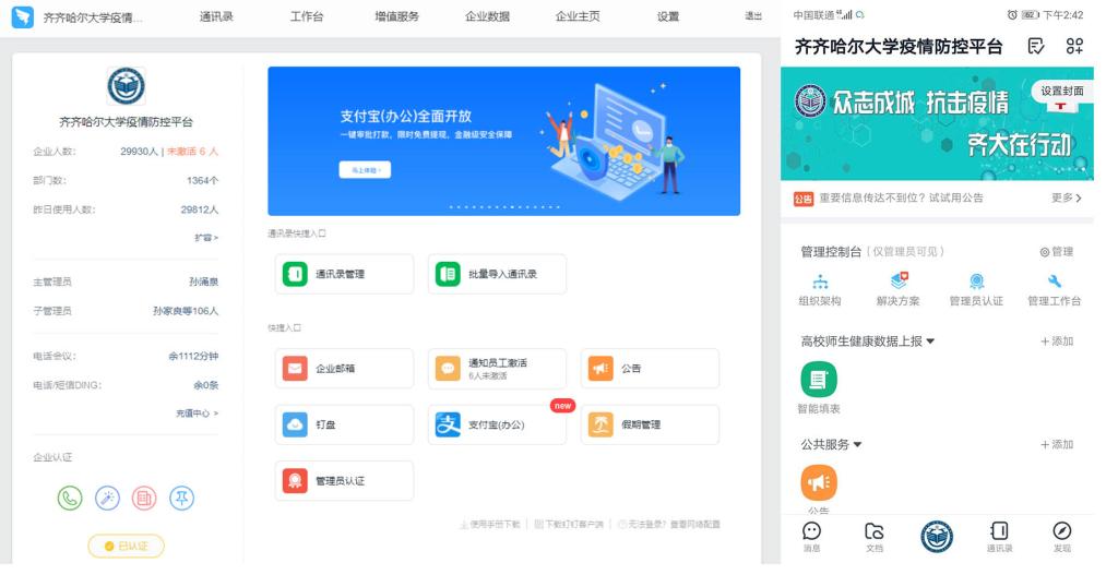 完成万象城AWC官方网站疫情防控平台的部署与数据上传。根据省教育厅文件精神,需要在全体师生中注册钉钉并依托钉钉搭建万象城AWC官方网站疫情防控平台,用于向黑龙江省教育系统疫情防控平台上报相关数据。20号接到任务,23号平台就要上线,时间紧任务量大,中心班子成员紧急动员几名党员作为管理员,分工负责万象城各部门师生的钉钉注册信息全面核实、子管理员培训、数据导入导出、人员激活、各单位的管理体系构建等工作。利用与完美数联疫情防控平台的对接,实现钉钉平台组织架构,再将师生的信息核对导入,对管理员各种操作培训,短短2天的时间,孙涌泉、祝文生、孙家良、宋峰、刘恩军持续奋战了近四十个小时,在23日早八点完成全校29930人的数据导入与激活工作,设计适合学校风格的钉钉用户界面,确保系统在23日开始正式上线运行,实现全校师生每日“一键”报告个人健康情况。