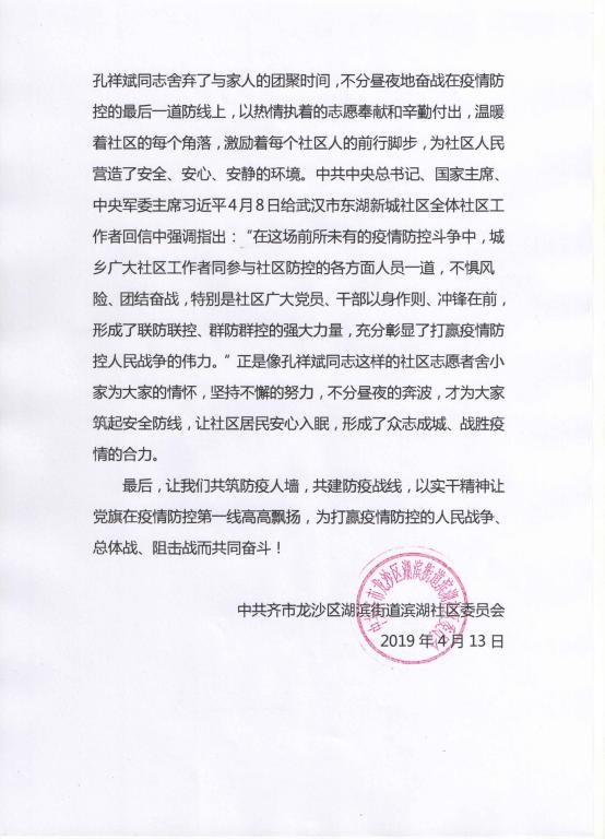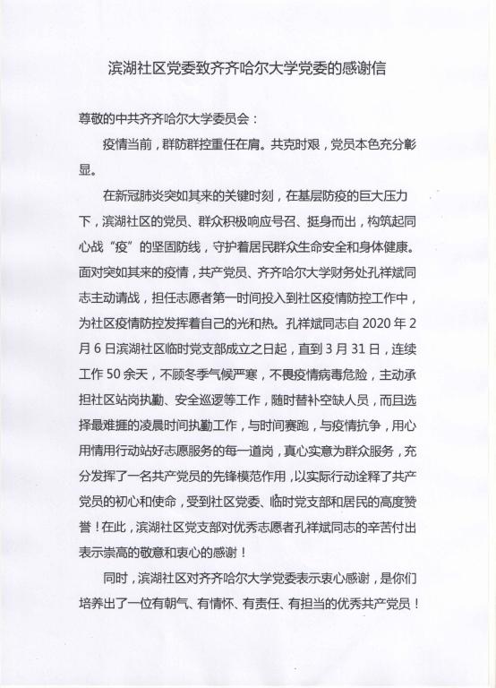 在抗击新冠疫情斗争中,万象城广大党员志愿者响应党的号召,积极参加志愿服务工作,财务处孔祥斌同志就是其中一位优秀代表,他的先进事迹被龙沙区滨湖社区专题简报第25期重点报道,被“中国经济新闻联播”和市委市政府的“鹤城发布”微信公众号等媒体上宣传,产生了积极而广泛的社会影响。4月13日,校党委收到齐齐哈尔市龙沙区滨湖社区党委送来的一封感谢信,信中对坚守奋战在滨湖社区抗疫一线近2个月的财务处党员志愿者孔祥斌同志给予赞扬和感谢,对万象城AWC官方网站党委的大力支持和热忱支援致谢。