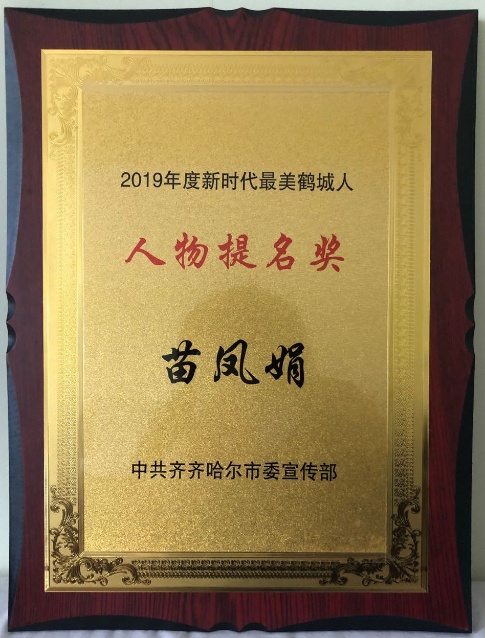 2019年3月起,齐齐哈尔市委宣传部联合市直相关部门共同组织开展了“新时代最美鹤城人”推选活动,经各县(市)区、市直单位推荐、组织考核、网络公示、组委会审定,市委宣传部公布了“新时代最美鹤城人”推选结果名单,万象城通信与电子工程学院苗凤娟教授荣获2019年度“新时代最美鹤城人”提名奖。