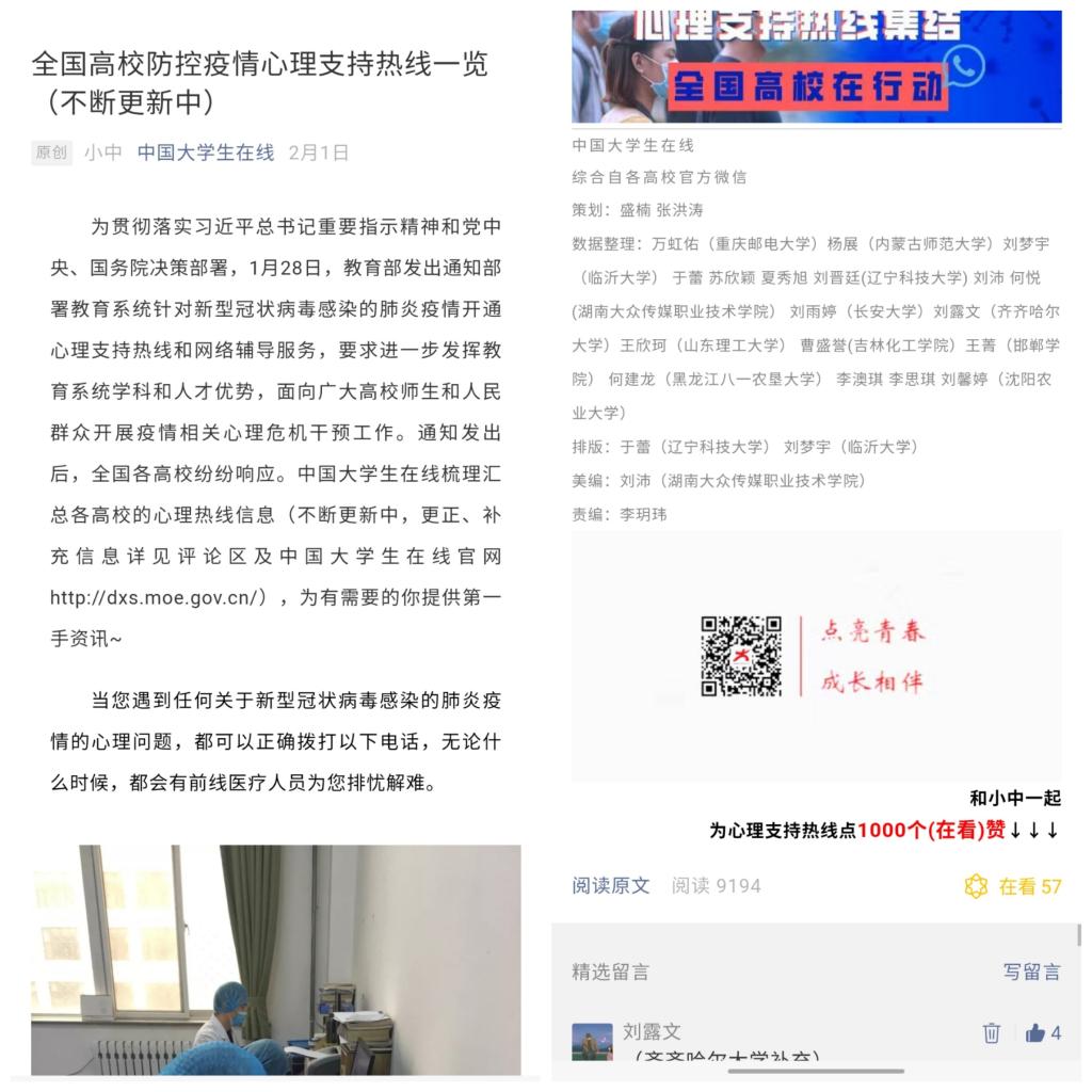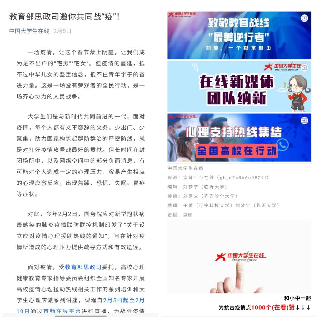 刘露文同学在实习期间,正值新冠疫情肆虐,他在关键时刻,能主动请缨、顶住压力、承担比平时实习工作量加倍的任务,并出色地完成了我部门布置的各项任务,有责任有担当、毫无怨言。他在工作实践中得到了成长,并在磨砺中得到了收获。由他参与策划和制作的“心理支持热线集结丨全国高校在行动”推文被教育部官微“微言教育”转载并单条发布,“@湖北大学生,你们是我们最牵挂的人!母校永远是你们的家”推文被“中华全国学联”官微转载,“教育部思政司党支部致全国高校辅导员的一封信”由在线首发。他在疫情期间作为大学生虽没法在抗疫一线抗战,但始终坚守岗位,认真负责完成了每一篇推文。该生参与到相关海报以及banner的制作,实习期间,该同学在中国大学生在线累计参与制作发表推文30篇以上,累计阅读量达到18万以上。