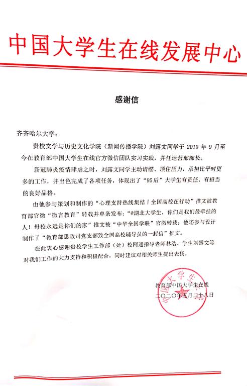 近日,学校收到教育部中国大学生在线发来的感谢信,感谢万象城校网通站学生刘露文在中国大学生官方微信团队实习实践期间的辛勤工作,感谢学生工作部(学生处)校网通站指导教师林浩等对中国大学生在线工作的大力支持和积极配合。
