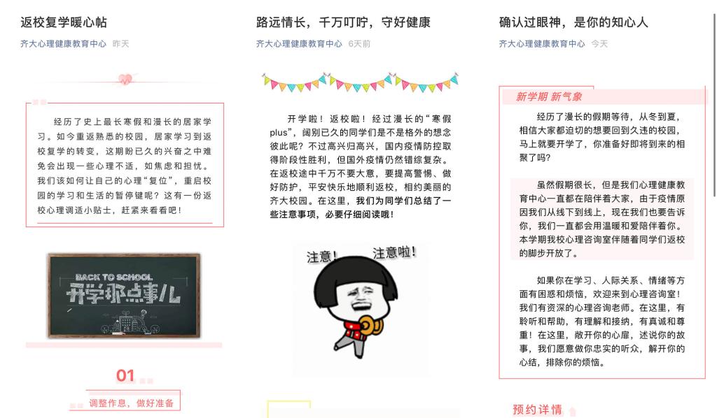 从冬到夏,从夏到秋,从线下到线上,学校心理健康教育中心一直用爱与温暖陪伴着同学们成长。新学期伊始,学校心理健康教育中心连续推出《返校复学暖心帖》、《确认过眼神,是你的知心人》,而且每一条信息最后都有一个关于天气情况的“温馨提示”,提醒同学们注意天气变化,适当增加衣物。