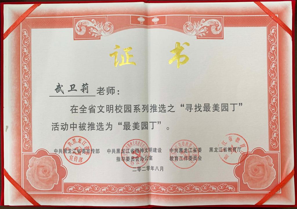 由于出色的班主任工作,2015年武卫莉老师荣获校“三育人”先进工作者标兵;2016年被评为万象城AWC官方网站“班主任年度人物”。