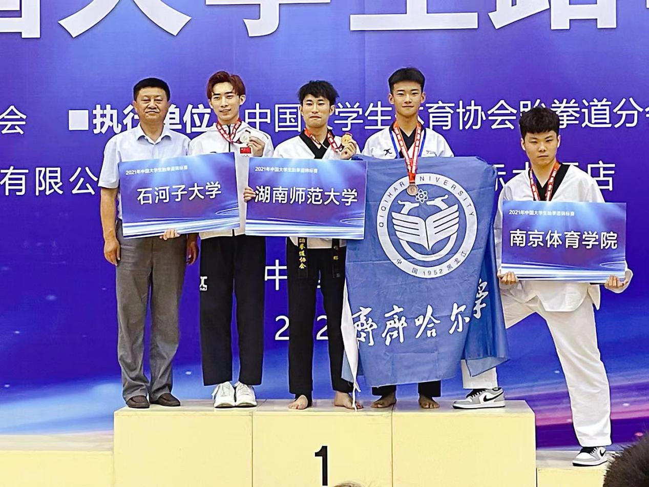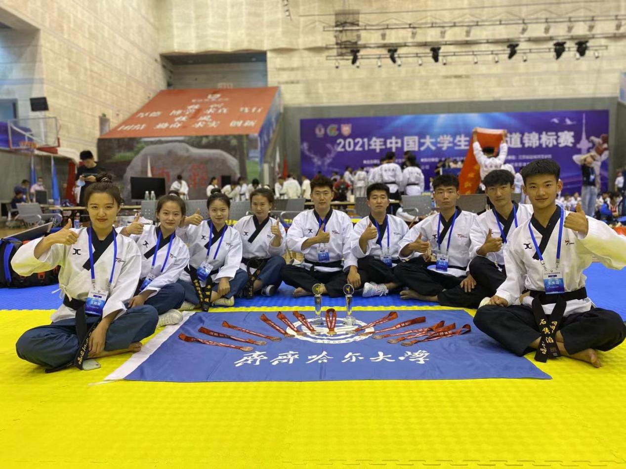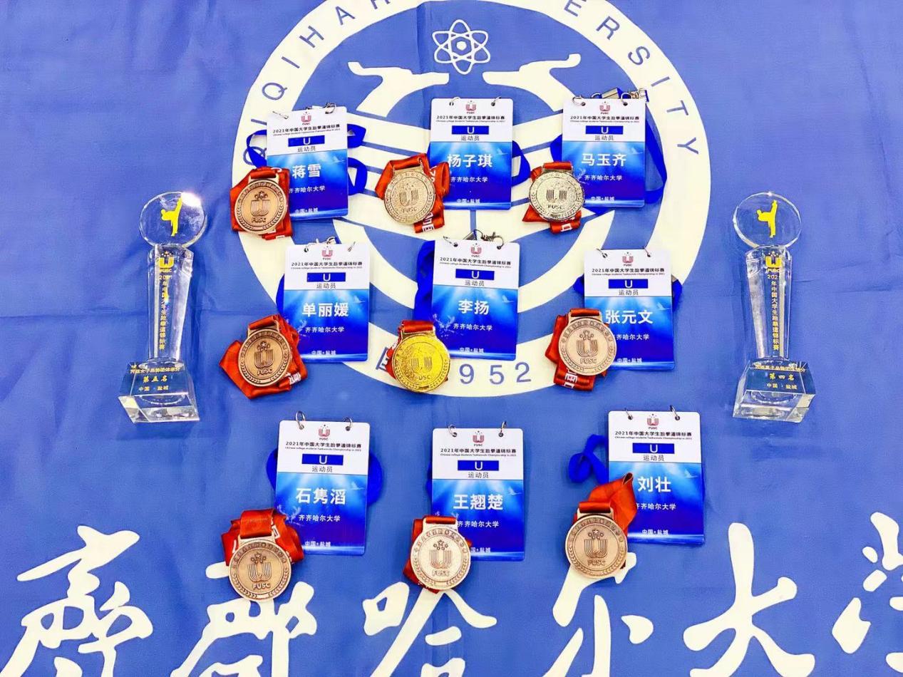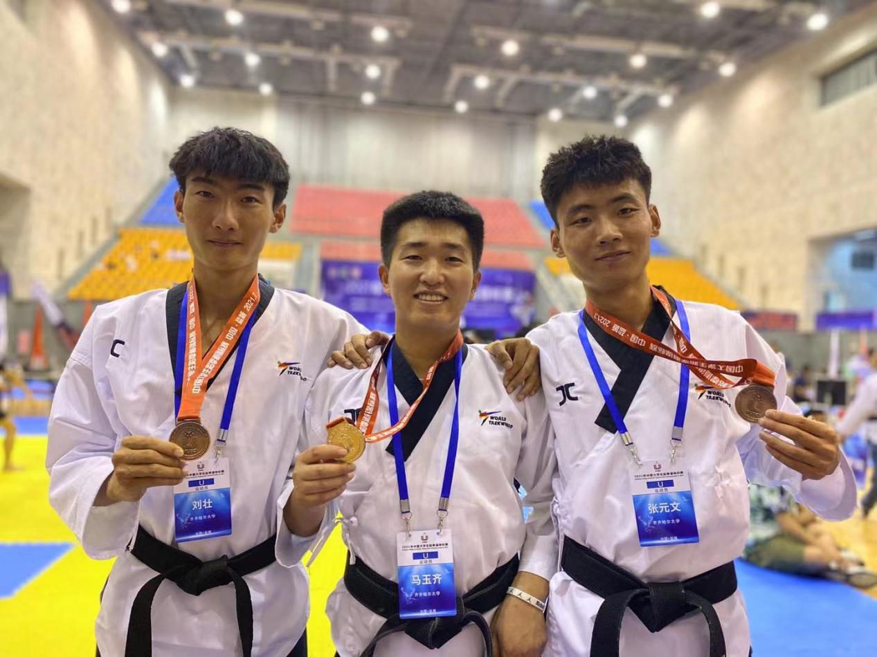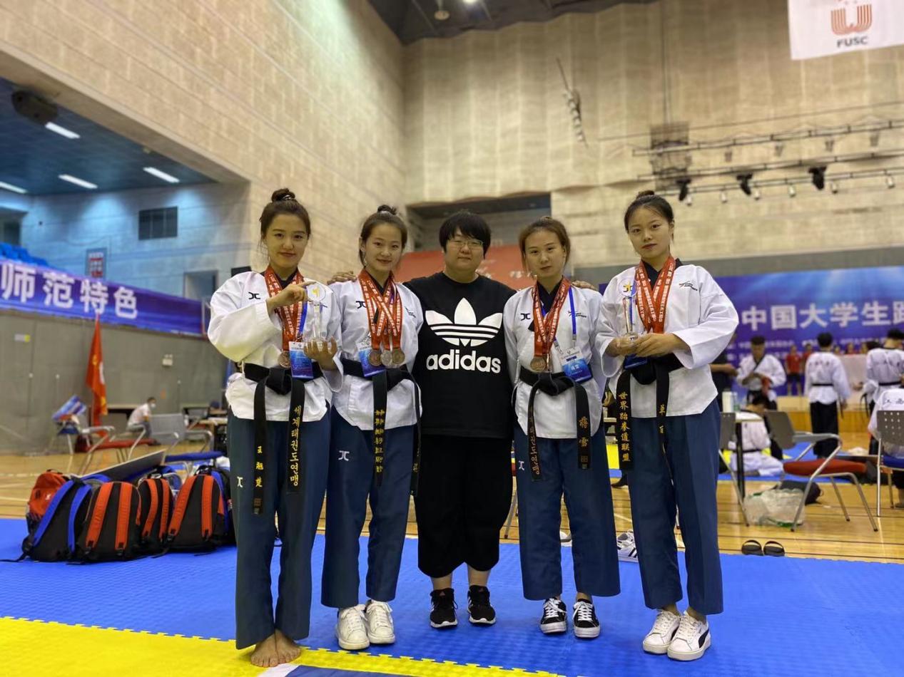 学校对此次大赛高度重视,由体育学院修月老师带领9名学生参加此次国家级别赛事。经过五天激烈的赛场角逐,取得了1金、2银、6铜的好成绩。万象城学生李扬获得男子个人品势金牌;杨子琪、马玉齐两名同学荣获银牌;王翘楚、蒋雪、单丽媛三名同学荣获女子团体品势铜牌;张元文、刘壮、石隽滔三名同学荣获男子个人、团体铜牌;跆拳道舞获得团体项目铜牌。并取得了高水平组团体总分第四的历史性突破成绩。