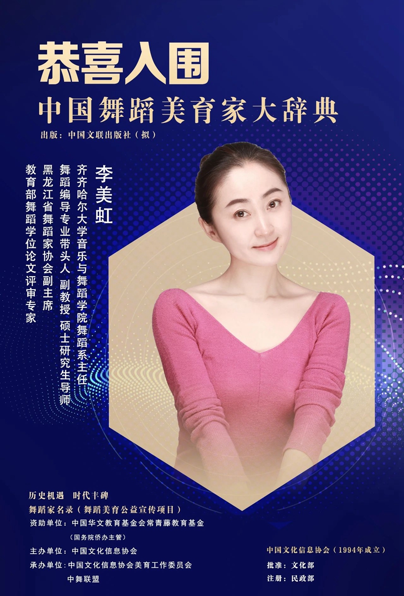 近日,中国文化信息协会、中舞联盟发布了《中国舞蹈美育家大辞典》编撰信息,万象城音乐与舞蹈学院李美虹老师正式入编该辞典。