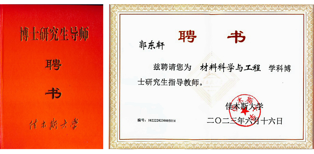 2020年,郭东轩以主要研究方向负责人身份加入黑龙江省精细化学品催化合成重点实验室研究团队从事科研工作。其所在研究团队围绕催化新材料的研制与开发、催化精细有机合成、储能材料及分离技术方向进行基础性研究和应用基础性研究工作,致力于推动我省石油化工产业转型升级,延伸石化加工产业链,提升化工产业精细化工率。在团队中,郭东轩充分展示出青年科研工作者的实力与活力。2021年底,他主持“基于小尺寸应变型MXene的钠离子电容器性能研究”项目获中央支持地方高校改革发展资金人才培养项目资助;2021和2022连续两年潜心申报国家自然科学基金,项目“晶格应变与微观孔隙协同调控MXene的构筑及钠离子电容器动力学与储能机理研究”于2022年获国家自然科学基金青年基金资助。入职后的3年内,他以通讯作者在《Small》《ACS Appl. Mater. Inter.》《J. Colloid Interf. Sci.》《J. Energy Storage》等国际知名期刊发表SCI检索学术论文37篇,其中中科院二区以上论文32篇,所发表文章Google学术引用超过1500次,获授权国家发明专利1项。同时,他还担任《Small Methods》《J. Energy Storage》《ACS Appl. Nano Mater.》等国际知名期刊的审稿专家。此外,郭东轩已培养多名优秀硕士研究生,多名同学赴哈尔滨工程大学、黑龙江大学、青岛大学、燕山大学等知名高等院校攻读博士学位,这充分展示了郭东轩及所在团队科研育人的实效。此外,郭东轩与北京大学深圳研究生院、上海交通大学、美国加州大学洛杉矶分校、加拿大滑铁卢大学等国内外顶尖院校的相关研究团队建立了良好合作关系,开展学术交流,本着优势互补、互惠互利、资源共享、共同发展的良好愿望,积极推进产学研合作,共同打造产学研示范基地,走出一条合作共建、互惠共赢的新路子,促进双方人才培养、科技创新能力的提升。2023年6月,他被佳木斯大学聘请为材料科学与工程学科博士研究生指导教师。