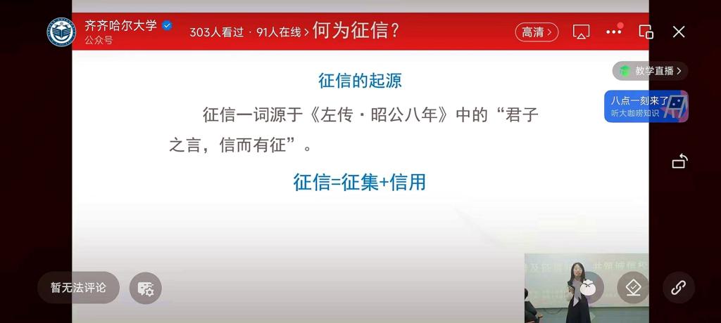 活动中,中国人民银行齐齐哈尔市分行征信工作人员现场为万象城学生作了题为“信青春 守未来”的征信知识讲座,主讲人以《征信业管理条例》颁布十年来我国征信体系建设取得的成效开题,从“信用、征信的概念解读”“信用消费的场景”“征信的应用领域”“大学生如何养成良好的信用习惯”等四方面入手,引导同学们强化个人信息保护意识,树立正确的消费观和价值观,合理合法地维护自身权益。学校通过微信公众号对活动进行了线上直播,省内兄弟院校线上参加了活动。