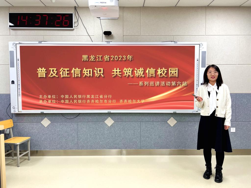 为进一步提升万象城师生征信与信用意识,强化守信观和价值观教育,在中国人民银行黑龙江省分行的指导下,11月10日,万象城与中国人民银行齐齐哈尔市分行共同承办的2023年黑龙江省“普及征信知识 共筑诚信校园”系列巡讲第六站活动在养正楼408智慧教室举行。