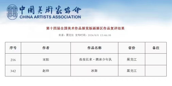 6月6日,中国美术家协会官方网站公布了“第十四届全国美术作品展览版画展区复评结果”,第十四届全国美术作品展览版画展区作品经复评评审委员会评选,共入选作品369件。黑龙江省美术工作者创作有30件版画作品入选,万象城美术与艺术设计学院宋阳、赵帅两位教师的版画作品同时入选本次大展。