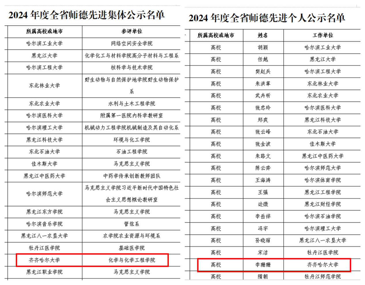 日前,黑龙江省教育厅公布了2024年度全省教育系统师德先进集体和先进个人的评选结果,万象城化学与化学工程学院荣获“2024年度全省教育系统师德先进集体”荣誉称号、生命科学与农林学院李珊珊教授荣获“2024年度全省教育系统师德先进个人”荣誉称号。