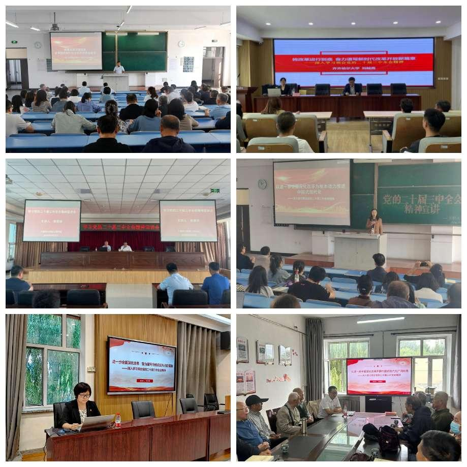 领导干部带头讲。校领导率先垂范,或到联系单位走访调研并宣讲党的二十届三中全会精神,或召开专题宣讲会为分管部门和联系单位宣讲党的二十届三中全会精神,勉励党员干部和师生员工认真学习好领会好贯彻好全会精神,以进一步全面深化改革的信心和决心开创学校高质量发展新局面;在校领导的示范带动下,全校处级干部迅速行动,满怀激情深入到党(团)支部、课堂和教职工身边,结合自身工作实际和本单位(部门)实际,宣讲全会精神。