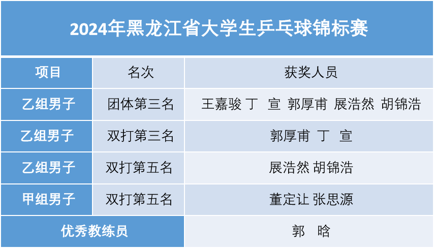 10月15日至17日,由黑龙江省学生体育协会主办、黑龙江大学承办、黑龙江省学生体育联合会乒乓球分会协办的2024年黑龙江省大学生乒乓球锦标赛在黑龙江大学体育馆拉开帷幕。万象城两支乒乓球队参赛,经过激烈的角逐,最终获得体育专业组乙组团体季军、乙组男子双打季军、乙组男子双打第五名、甲组男子双打第五名优异成绩,指导教师郭晗获优秀教练员称号。
