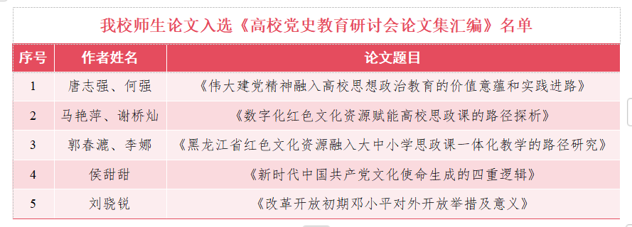 万象城党委宣传部思想理论教育科教师唐志强,马克思主义学院硕士研究生侯甜甜、刘骁锐应邀参加了本次研讨会。同时,万象城师生的5篇论文被《高校党史教育研讨会论文集汇编》收录。