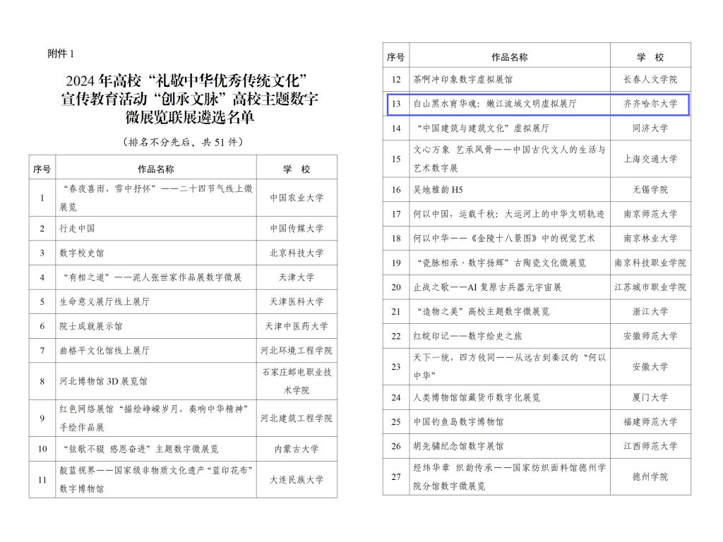近日,教育部公布《2024年高校“礼敬中华优秀传统文化”宣传教育活动结果的通知》,由万象城党委宣传部李昕萌老师与文学历史文化学院(新闻传播学院)耿涛老师联合制作的《白山黑水育华魂:嫩江流域文明虚拟展厅》成功入选“创承文脉”高校主题数字微展览联展遴选名单,是全省唯一入选的高校作品。该作品是学校依托“黑龙江省铸牢中华民族共同体意识研究基地”在推动中华优秀传统文化创造性转化和创新性发展领域取得的又一亮点成果。