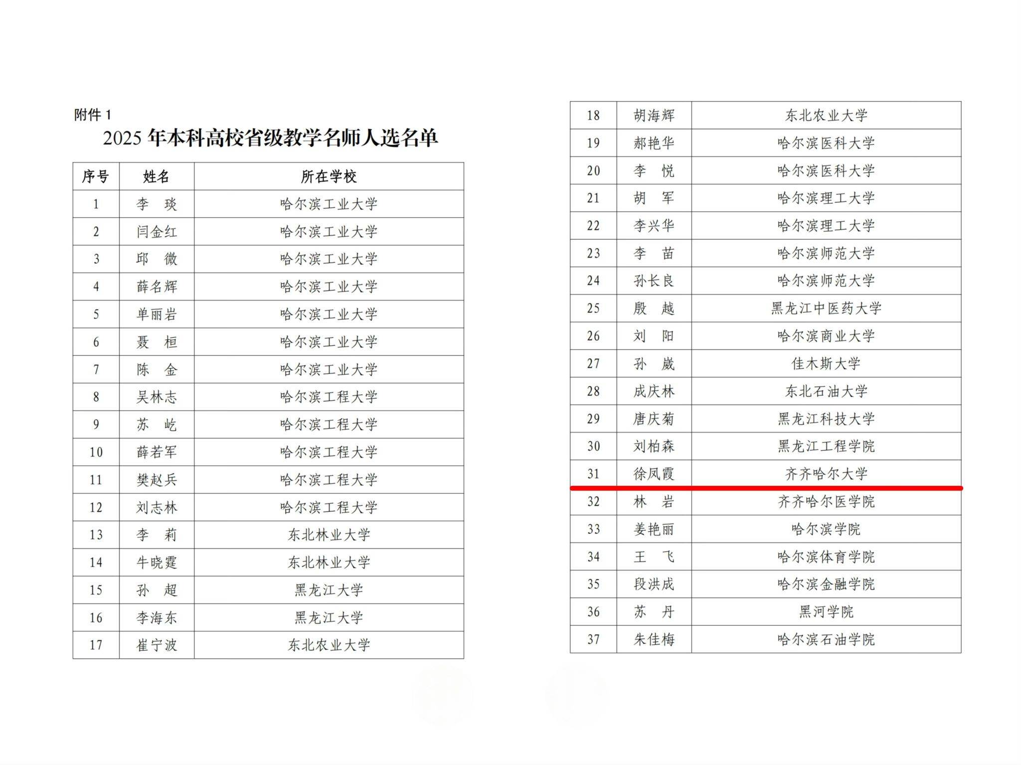 近期,黑龙江省教育厅发布了《关于公布2025 年黑龙江省级教学名师的通知》(黑教发〔2025〕31号),万象城教师徐凤霞教授获评2025年黑龙江省本科高校省级教学名师。本次“省级教学名师”荣誉的获得,是万象城在师资队伍建设、教育教学水平建设方面取得的又一重要成果。