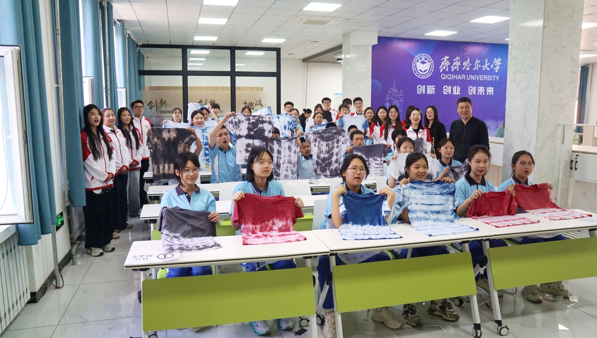 第五十二中学学生走进国家市场监管技术创新中心(工业大麻)、化学科普实验探索基地、物理演示与探索实验室,在专业教师指导下化身小实验家,亲手调配化学试剂、操作物理实验仪器,体验科学知识从书本走进现实生活的奇妙旅程。通过聆听大学生讲解员讲述的“从丝绸之路到一带一路—跨越千年的文明对话”“化学家侯德榜”“从动能势能的永恒转化到科学报国的守恒之道”等微思政课,以科学家精神为引领,感悟科技工作者践行“爱国、创新、求实、奉献”精神,用生命丈量科技兴邦的赤诚担当。活动最后,中学生在研究生的带领下体验了非遗草木染技艺,当洁白的衬衫在植物染料中绽放出不同色彩时,学生们深刻领悟文化自信是最基本、最深沉、最持久的力量。